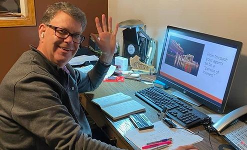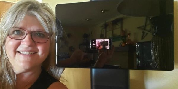 Kim Severns showing us her new Facebook Portal for being the winner of our 2020 "Writing From a Distance" Sales Contest.